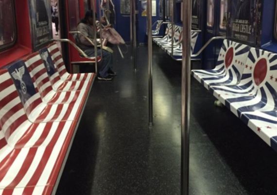 People riding New York City’s Subway near Times Square have been seeing large advertisements displaying Nazi symbols.