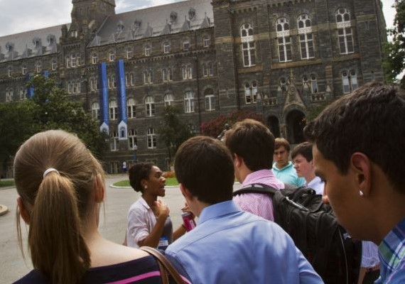 Prospective students tour Georgetown University’s campus in Washington, DC