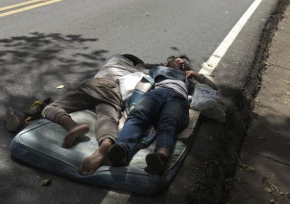 Venezuelan migrants sleep on a mattress on the side of the highway