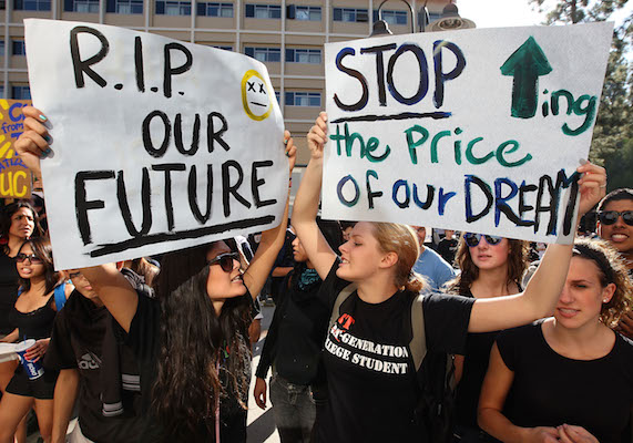 LOS ANGELES, CA – NOVEMBER 19: University of California Los Angeles (UCLA) students and supporters protest as the UC Board of Regents meets to vote on a 32 percent tuition hike next year on November 19, 2009 in Los Angeles, California. Undergraduate fees for students at the California university system would be paying about $2,500 more. It is the second day that demonstrators, including students from other UC campuses, have gather to try to dissuade the board from approving the proposed increase. Massive cuts to balance the state budget have squeezed education funds in California. (Photo by David McNew/Getty Images)