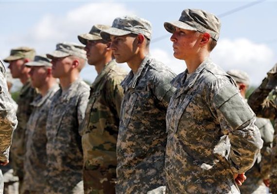 U.S. Army First Lt. Shaye Haver, right, stands in formation during an Army Ranger school graduation ceremony Friday, Aug. 21, 2015, at Fort Benning, Ga. Haver and Capt. Kristen Griest became the first female soldiers to complete the Army’s rigorous school, putting a spotlight on the debate over women in combat. (AP Photo/John Bazemore)