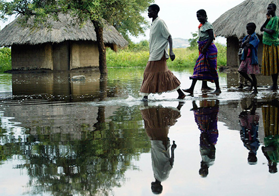 Ugandan women and children walk past submerged homes in an area flooded by heavy rains in Soroti, Uganda, Sept. 18 2007.