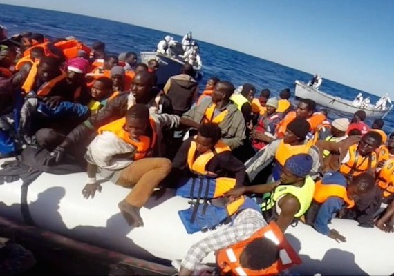 This handout video grab released by the Italian Coast Guard (Guardia Costiera) on May 2, 2015 shows some of 220 shipwrecked migrants being rescued by the Italian coast guard, on May 1, 2015, in the Mediterranean Sea, off the coast of Sicily. AFP PHOTO / GUARDIA COSTIERA