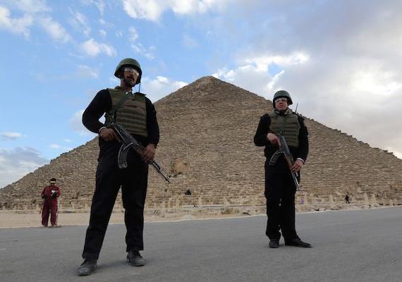 Police officers guard the Great Pyramid of Cheops in Giza, on the outskirts of Cairo January 16, 2015 .REUTERS/Mohamed Abd El Ghany (EGYPT – Tags: CRIME LAW SOCIETY TRAVEL)
