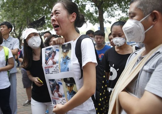 A family member (C) of a missing firefighter from the recent explosions at a chemical warehouse protests outside a hotel where authorities are holding a press conference in Tianjin on August 16, 2015. Furious, frustrated and fearful, relatives of the missing in the giant explosions in Tianjin besieged officials demanding answers on their loved ones’s fates – only for security to intervene instead. The death toll from two massive explosions in the Chinese port of Tianjin has risen to 112, an official said on August 16. CHINA OUT AFP PHOTO (Photo credit should read STR/AFP/Getty Images)