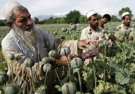 FILE – In this May 10, 2013 file photo, Afghan farmers collect raw opium as they work in a poppy field in Khogyani district of Jalalabad, east of Kabul, Afghanistan. Afghanistan’s opium production surged in 2013 to record levels, despite 12 years of international efforts to wean the country off the narcotics trade, according to a report released Wednesday by the U.N.’s drug control agency. (AP Photo/Rahmat Gul, File)