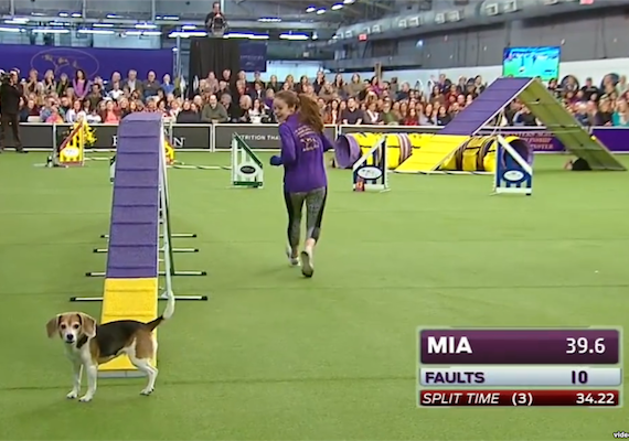 Mia the beagle gets distracted by the audience.