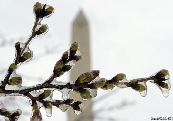 Some cherry blossom buds can be seen covered with ice due to recent cold weather in Washington, D.C.