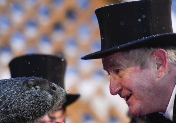 Groundhog Club President Jeff Lundy interacts with Punxsutawney Phil