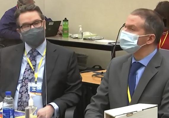 Former Minneapolis police officer Derek Chauvin (R) listens at the opening of his trial for murder of George Floyd