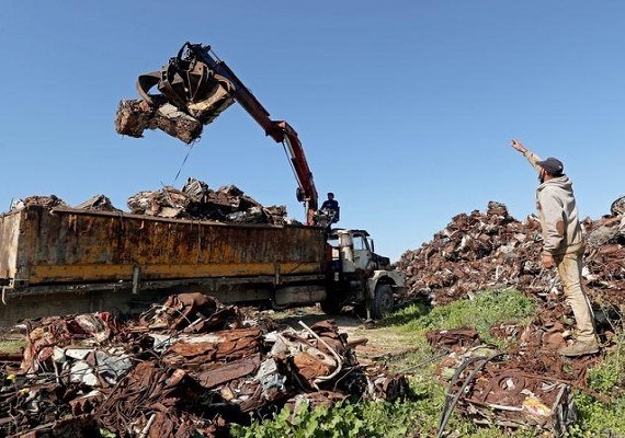 Palestinian worker sorts scrap metals to be pressed in preparation for export
