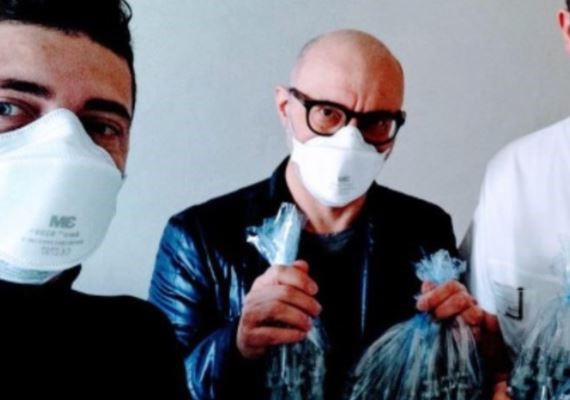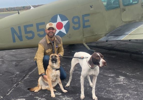 Pilot Eduard Seitan kneels in front of his plane with two rescue dogs