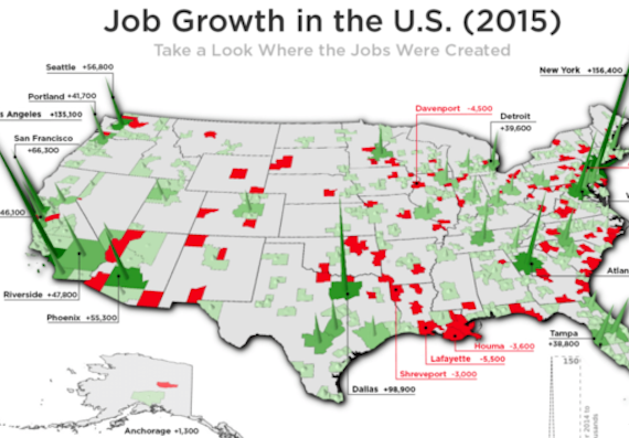 Job growth happened on the east and west coasts of the U.S. last year, according to the Bureau of Labor Statistics.
