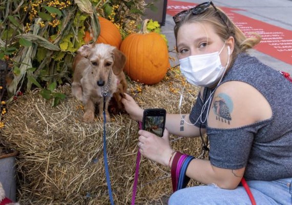 A pet owner takes pictures of her dog in front of Halloween decorations