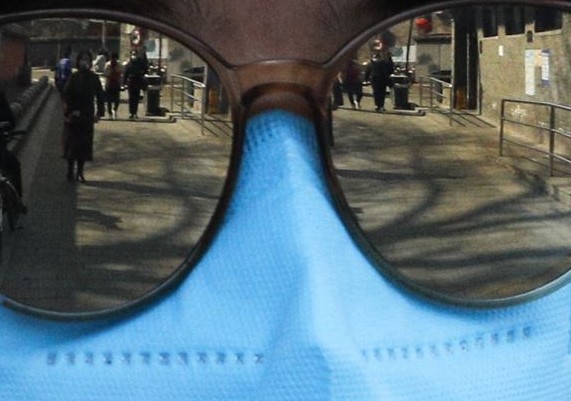 People are reflected on a volunteer’s sunglasses outside a closed neighborhood alley following the coronavirus outbreak in Beijing