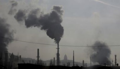 Smokestacks near an oil refinery are seen in front of the Utah State Capitol as an inversion settles over Salt Lake City.