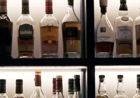 A vast array of fine single malt Scotch bottles are seen in a display case