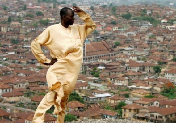 Yinka Sotomi stands atop Oluma Rock, a spiritual site for the Yoruba tribe
