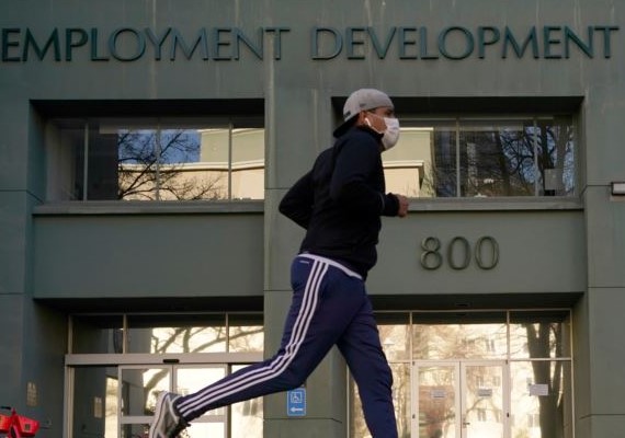 A runner passes the office of the California Employment Development Department in Sacramento