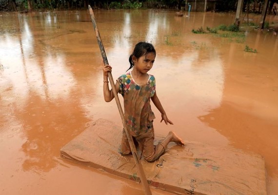 Samled Inthavong of Attepeu Province, Laos, was trying to get his family into a boat when a building hit his house.